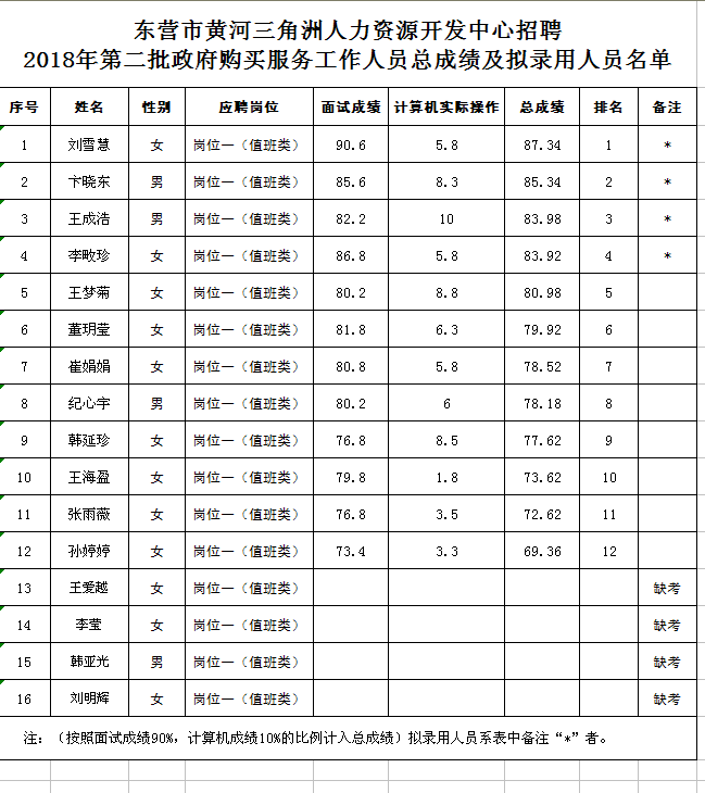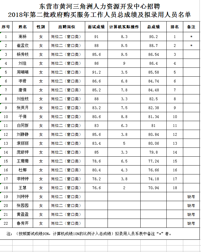 根據(jù)本次招聘活動(dòng)的安排,現(xiàn)將東營(yíng)市黃河三角洲人力資源開發(fā)中心招聘2018年第二批政府購(gòu)買服務(wù)工作人員的總成績(jī)及擬錄用人員名單予以公布。望擬錄用人員按照統(tǒng)一規(guī)定和要求辦理相關(guān)手續(xù)。